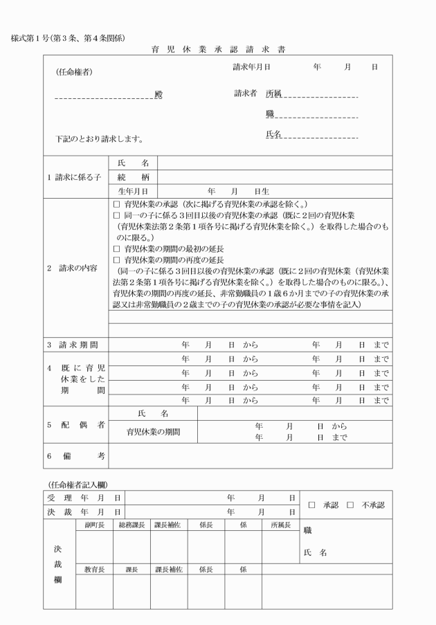 第4条 育児休業の期間の延長の請求は、育児休業承認請求書により行い、条例第3条第7号に規定する職員が任期を更新されることに伴い育児休業の期間の延長を請求する場合を除き、育児休業の期間の末日とされている日の翌日の1月(次に掲げる育児休業の期間を延長しようとする場合は、2週間)前までに行うものとする。
