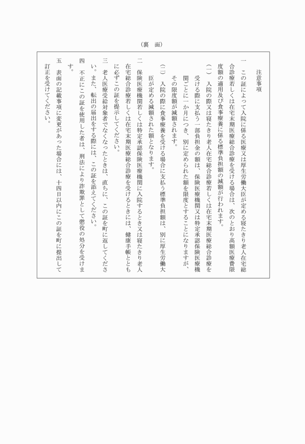 エ 健康手帳の医療受給者証(その届出が特定疾病受療証又は限度額適用・標準負担額減額認定証を交付されている者に係るものである場合にあっては、健康手帳・医療受給者証及び特定疾病受療証、入院時一部負担金限度額適用認定証又は入院時一部負担金減額・薬剤一部負担金免除認定証)を提出させ、これを回収するか又は無効の表示を行った上返却すること。