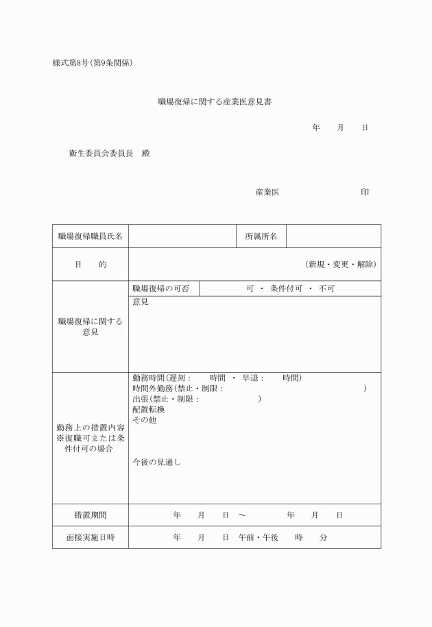 (2) 復帰職員の職場復帰に関して、職場復帰に関する産業医意見書(様式第8号)により委員長へ意見すること。