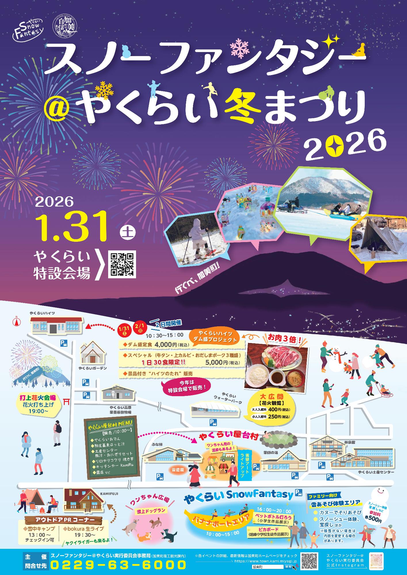 やくらいの冬を盛り上げる「スノーファンタジー@やくらい冬まつり2026」を開催します。日中はスノーシュー体験や雪上バナナボートなどのアクティビティや、夜は打上花火やペットボトル灯篭によって幻想的に照らします。